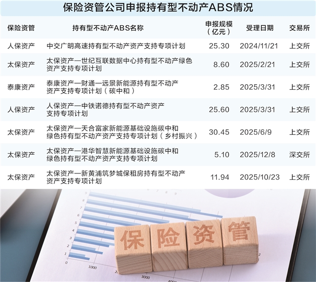 自2023年10月获批交易所资产证券化及不动产投资信托基金(REITs)业务试点以来,截至2025年末,国寿资产、泰康资产、太保资产、人保资产、平安资管等5家保险资管公司已累计向沪深交易所申报20单ABS项目,规模为320.53亿元。